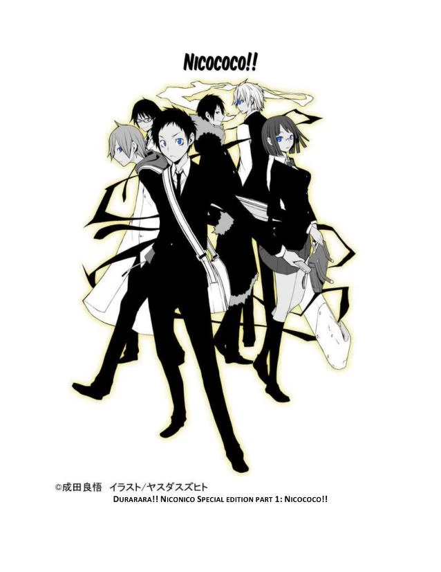 Nicococo!! is a Durarara!! short story that takes place after the conclusion of the original series and serves as a prequel for Durarara!! SH. The story was released for Niconico, a Japanese video-sharing site, in 2014 to jointly commemorate the 10th anniversary of Durarara!! and the 20th anniversary of Dengeki Bunko. It was shortly after included in Durarara!! Gaiden!?, the Durarara!! side story anthology, where like the series' anime adaptation, it is set up in four parts, following the classic structure of Japanese storytelling, kishōtenketsu (起承転結). The first part is titled Ki (起) to represent introduction, the second Shou (承, lit. understanding): the development, the third Ten (転, lit. motion): the twist, and the fourth Ketsu (結): the conclusion. In the story's independent release, each part was titled following the series' light novel naming system, using x and the number corresponding to its release.